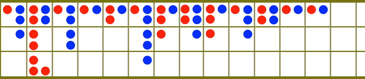 • 齐整,大路当前参照点的前两列(不包括参照点所在的列)的红蓝的个数是否相等。
